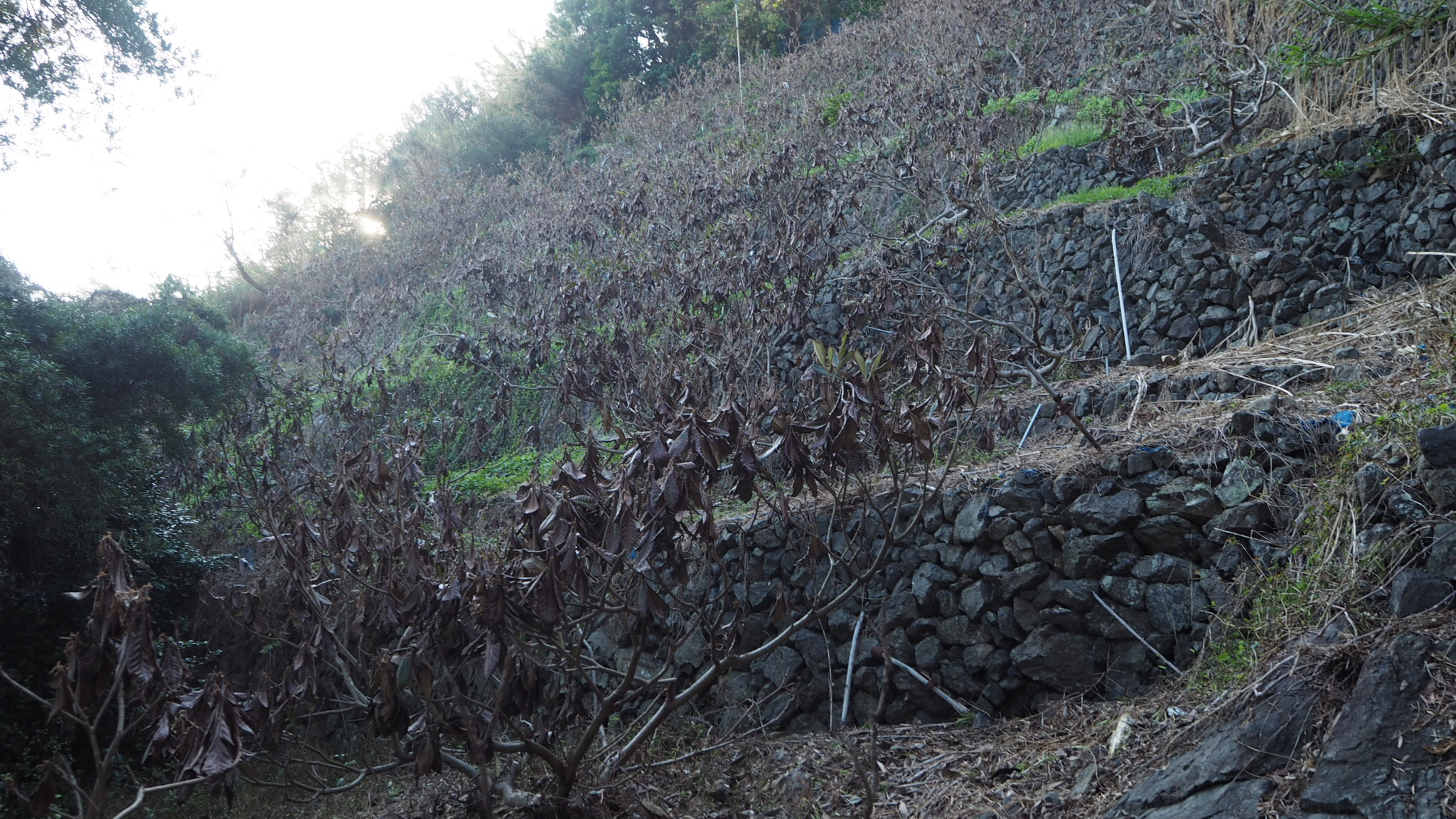 また海に面した畑では潮風による塩害が発生。枇杷の畑と不知火の苗木畑の2ヶ所が全滅してしまいました。新たに植え直しても収穫できるまで5年はかかります。