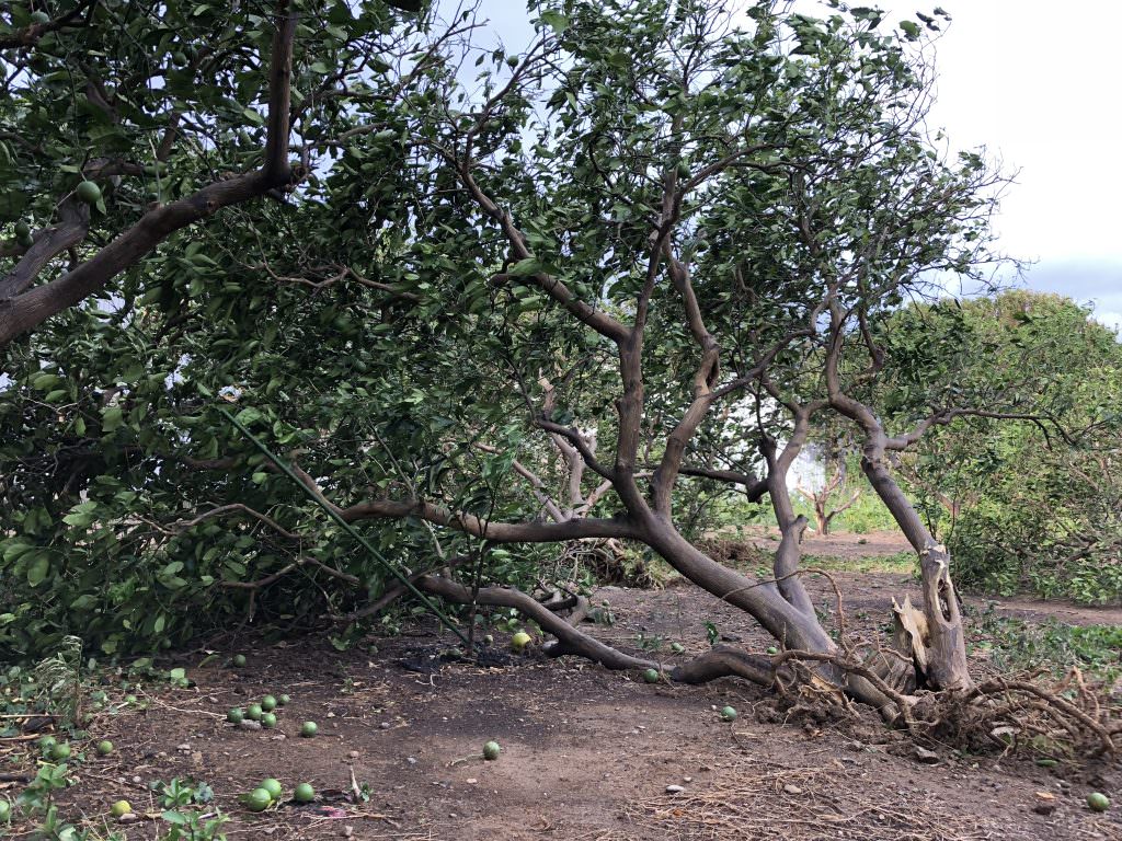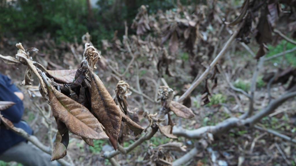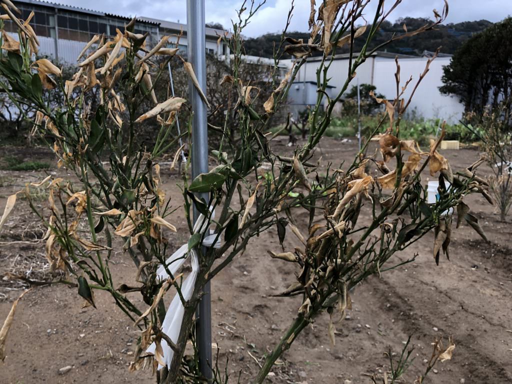 また海に面した畑では潮風による塩害が発生。枇杷の畑と不知火の苗木畑の2ヶ所が全滅してしまいました。新たに植え直しても収穫できるまで5年はかかります。