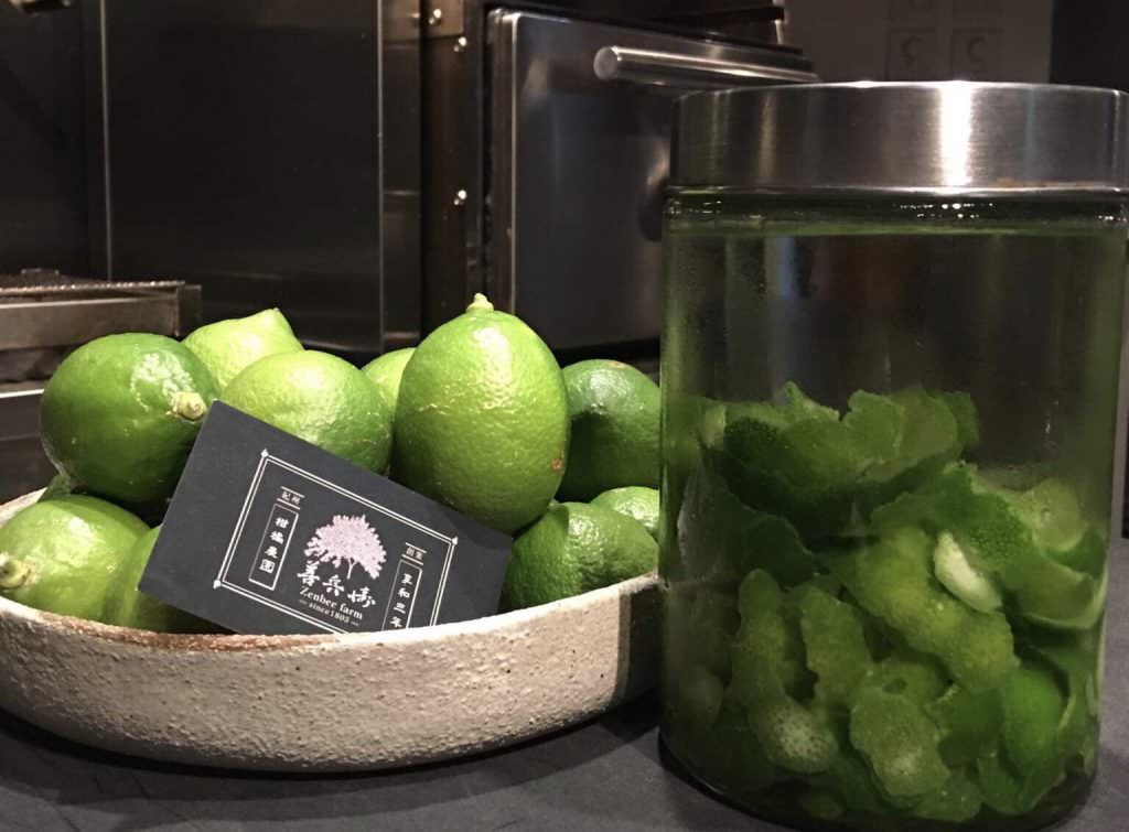 こちらの写真はグリーンレモンの皮をつかってチェッロにしているところ。